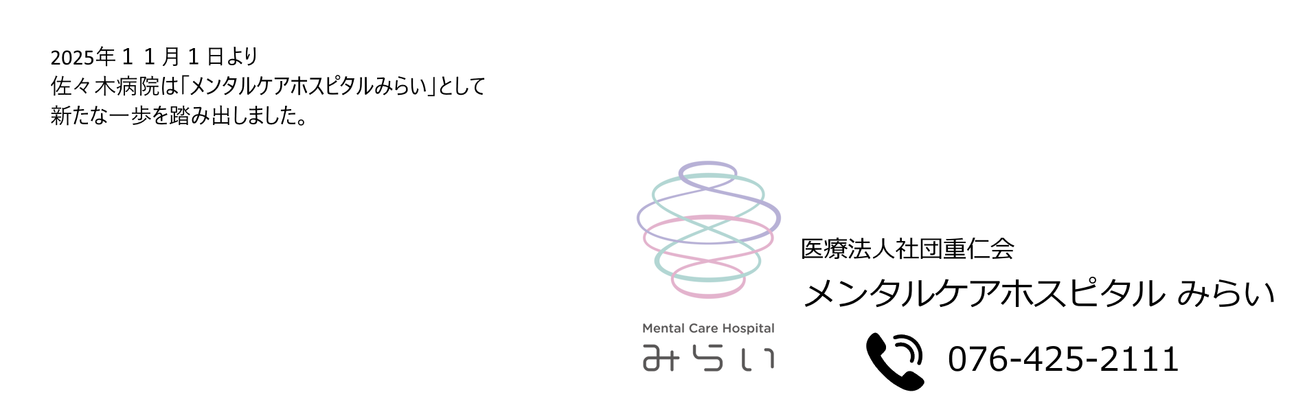 この度、医療法人社団重仁会佐々木病院は、新病院建築完成に伴い令和7年11月1日に移転すると同時に病院名をあらためまして医療法人社団重仁会「メンタルケアホスピタル みらい」として、新たな出発をすることになりました。つきましては、新病院への移転作業の為、外来診療の休止期間を設けさせて頂きます。